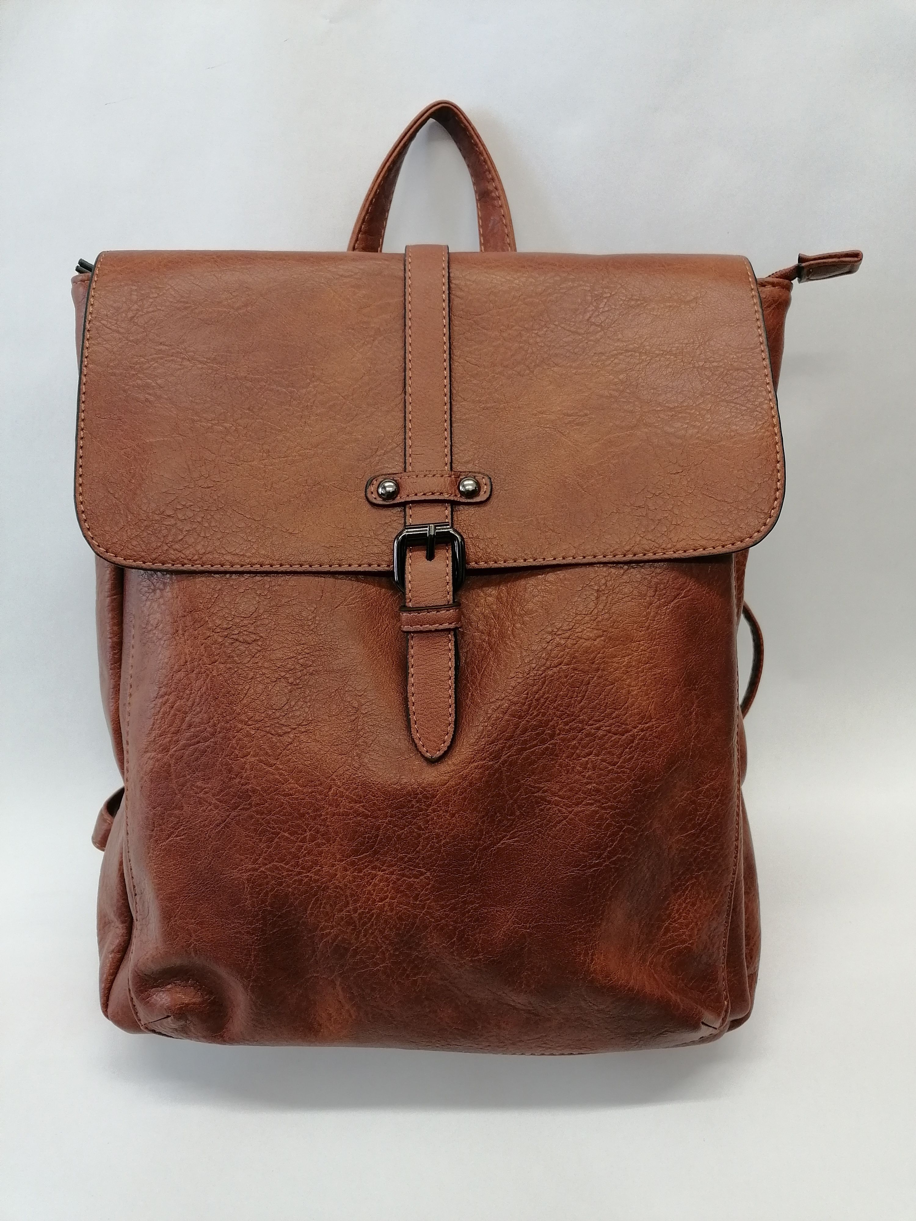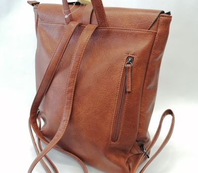 Batoh Melanie VEGAN koňakový z eko kůže . Rozměry: výška 36 cm, šířka 26 cm, hloubka dno 9 cm a nahoru se zužuje do 6 cm hloubky. Pod klopnou je kapsa uzavíratelná na patent a je široká 25 cm a vysoká 27,5 cm. Hlavní velký prostor se uzavírá na zip. Uvnitř batohu v hlavní části jsou 2 malé kapsičky na drobnosti a jedna kapsa uzavíratelná zipem o délce 17 cm. V zadní části (záda) je další vsazená kapička uzavíratelná 17 cm zipem.