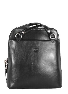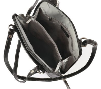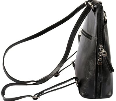 Kožený batoh má nastavitelné popruhy. Batoh tak lze nosit na zádech jako klasický batoh anebo na rameni jako kabelku. Na přední straně batohu je kapsička na magnet a na zadní straně je kapsa na zip. Batoh se uzavírá na zip a je vybaven dvěma jezdci. Uvnitř batohu je látková podšívka. Batoh má přepážku se zipem. Větší otevřená kapsa a kapsa na zip.