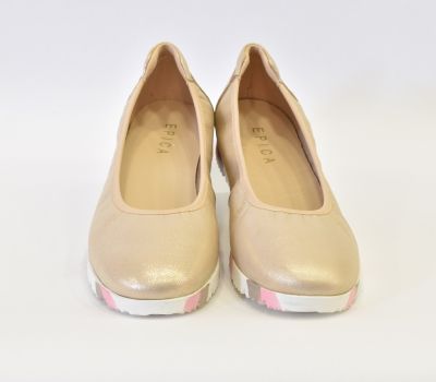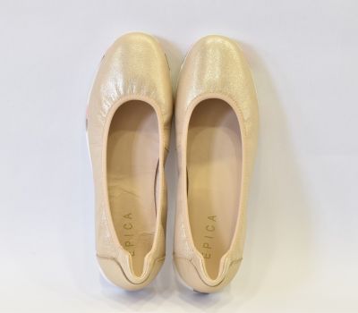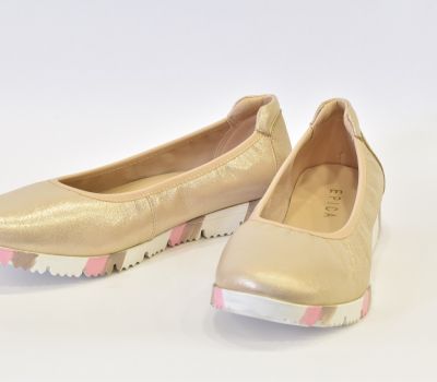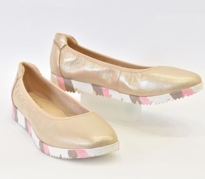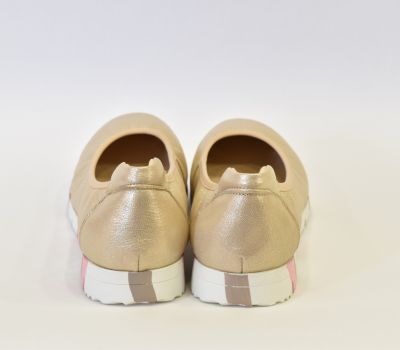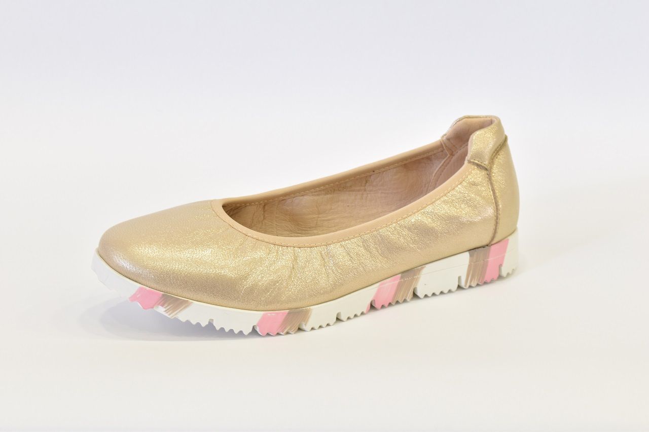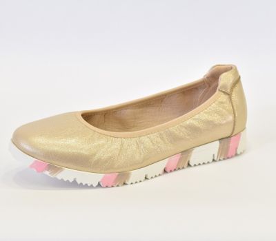 Tato celokožená balerína vás zaujme na první pohled svým luxusním zpracováním. Při celodenním nošení oceníte vyměkčenou koženou stélku, která dodá vaším chodidlům pocit komfortu. Celá obuv je vyrobená z měkoučké kůže, která se přizpůsobí každému tvaru nohy. Tento model oceníte při každodenním nošení , ale i při společenských událostech. Barva obuvi je pudrová v kombinaci se zlatou. Obuv má kolem nártu gumičku pro lepší přizpůsobení se noze.
