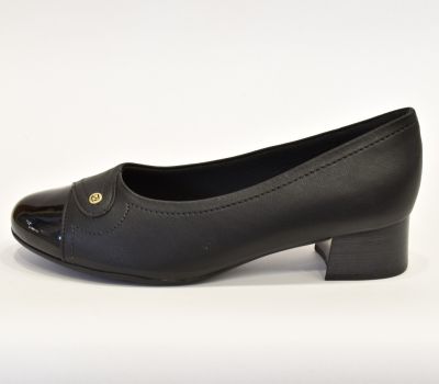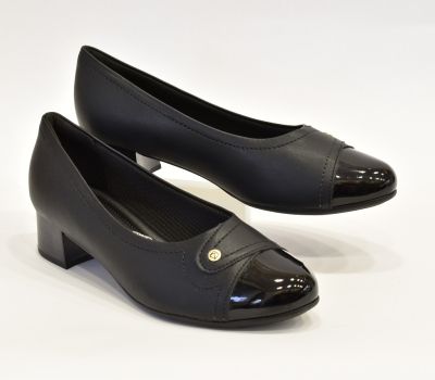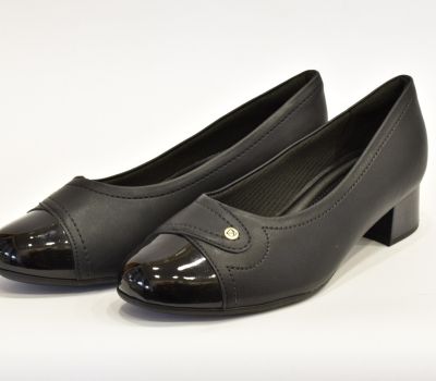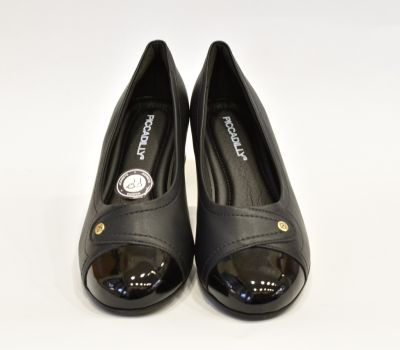Pohodlné dámské černé lodičky s ozdobnou lakovanou špičkou Piccadilly na středním podpatku. Dámská obuv brazilské značky Piccadilly je velmi luxusní a komfortní. Všechny modely této značky jsou vybaveny gelovými opatky, které chrání paty před otlaky. Modely na nízkých i vysokých podpatcích mají anatomicky tvarované stélky a gelovou vložku zajišťující pohodlnou chůzi. Stélky jsou vyrobeny propracovaným systémem kanálků a drážek, které přivádějí vzduch po celé délce chodidla, rovnoměrně rozvádějí tlak na chodidlo a tlumí silné nárazy při došlapu, tím chrání klouby dolních končetin a páteř. Stélky jsou antibakteriální a antimikrobiální a zabraňují vznikání nepříjemných pachů. Obuv je vybavená gelovými opatky, a proto je nutné při obouvání používat lžíci na obuv.