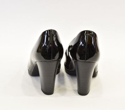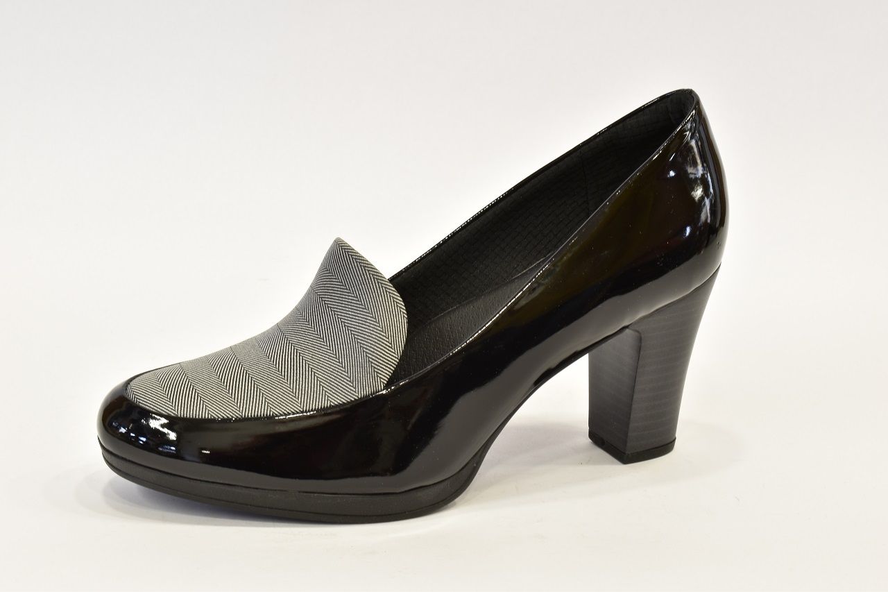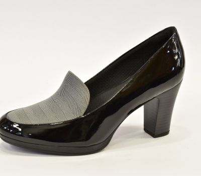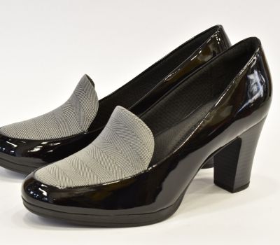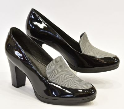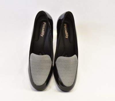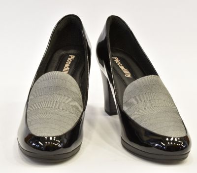 Dámská lodička na vyšším podpatku v barvě černé lakované v kombinaci s karovaným nártem. Dámská obuv brazilské značky Piccadilly je velmi luxusní a komfortní. Všechny modely této značky jsou vybaveny gelovými opatky, které chrání paty před otlaky. Modely na vysokých podpatcích mají anatomicky tvarované stélky a gelovou vložku zajišťující pohodlnou chůzi. Stélky jsou vyrobeny propracovaným systémem kanálků a drážek, které přivádějí vzduch po celé délce chodidla, rovnoměrně rozvádějí tlak na chodidlo a tlumí silné nárazy při došlapu, tím chrání klouby dolních končetin a páteř. Stélky jsou antibakteriální a antimikrobiální a zabraňují vznikání nepříjemných pachů. Obuv je vybavená gelovými opatky, a proto je nutné při obouvání používat lžíci na obuv.