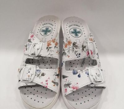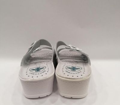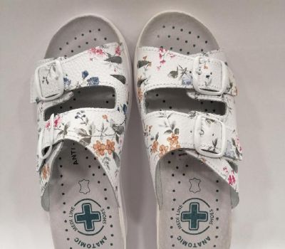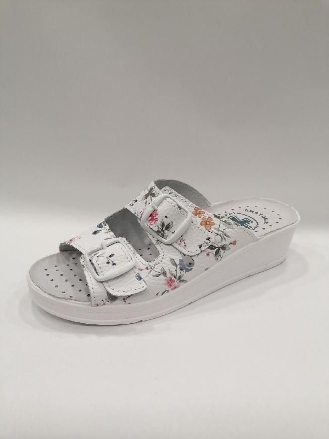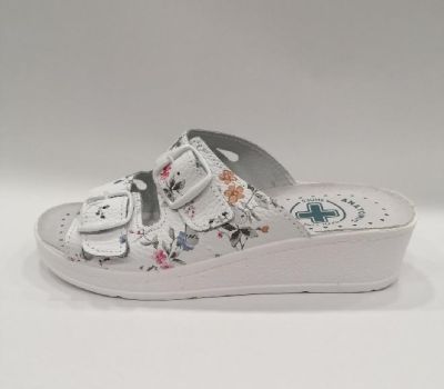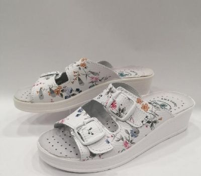 Zdravotní pantofle na mírném klínku celokožená MEDI 703, bílá kůže s kvítky. Nazouvací zdravotní obuv má dva nastavitelné pásky na nártu. Obuv vhodná pro jakékoliv deformity nohou a kladívkové prsty. Svou přizpůsobivostí a pohodlím se řadí mezi zdravotní boty, které navíc i krásně vypadají. Svršek : kůže, Podšívka : kůže, Podešev : kvalitní syntetika, Platforma s klínkem 2- 4 cm vysoká, mnoho let osvědčená kvalita