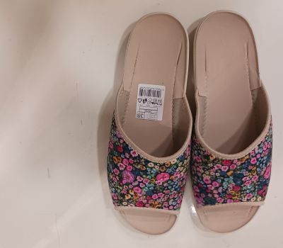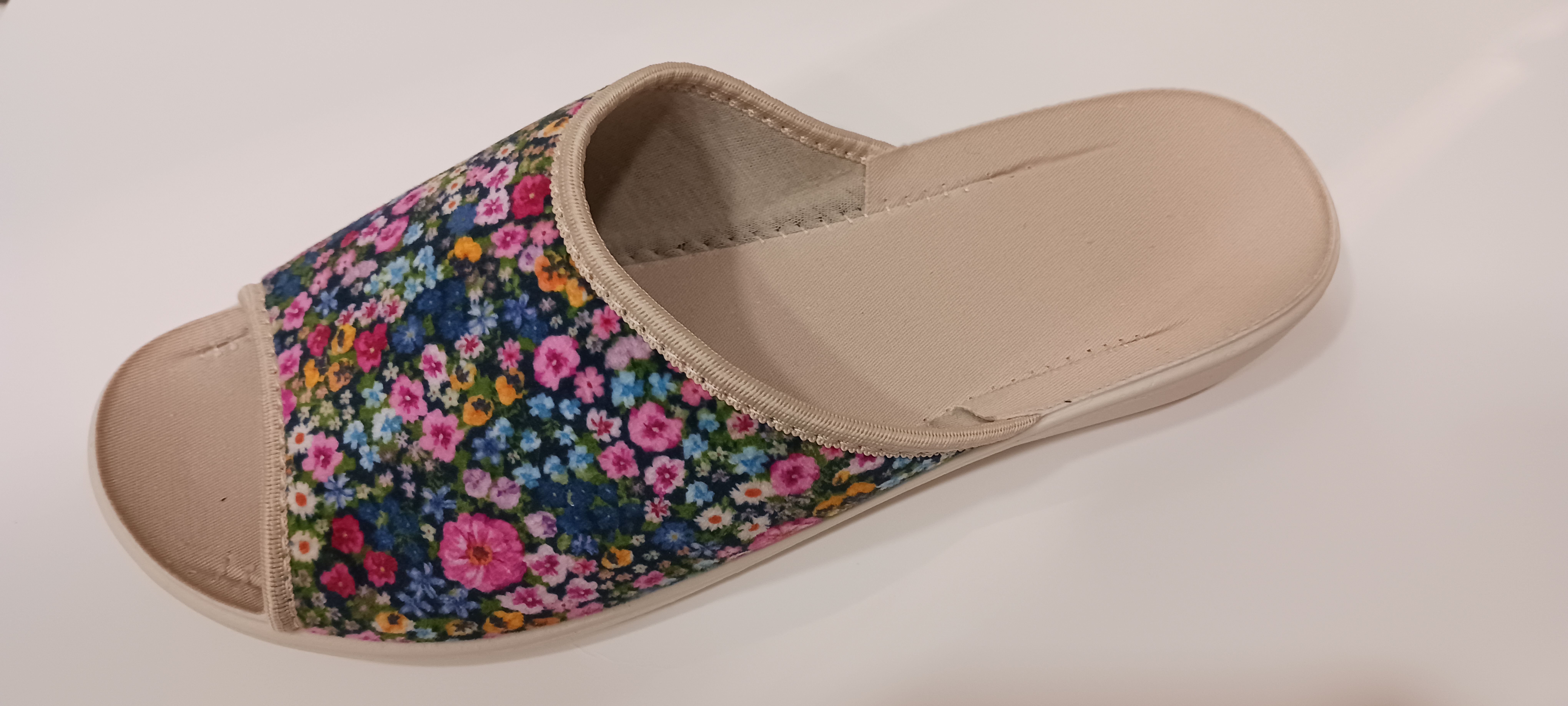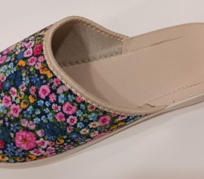 Pohodlná dámská domácí obuv na velmi lehké tvarované podešvi z textilního materiálu v béžové barvě s motivem květů. Lehká podešev poskytující jistotu a komfort v pohybu se přizpůsobuje anatomii chodidla, zvyšuje jeho stabilitu a zmírňuje sílu dopadu nohy na podlahu.