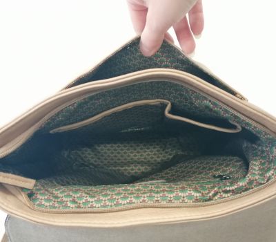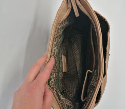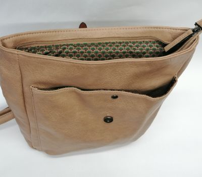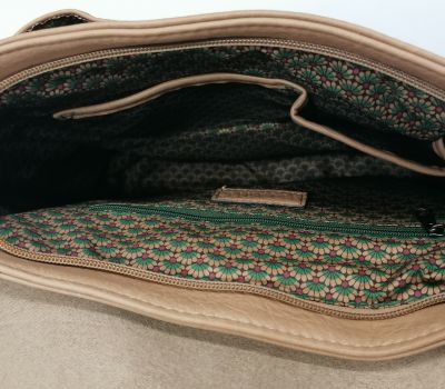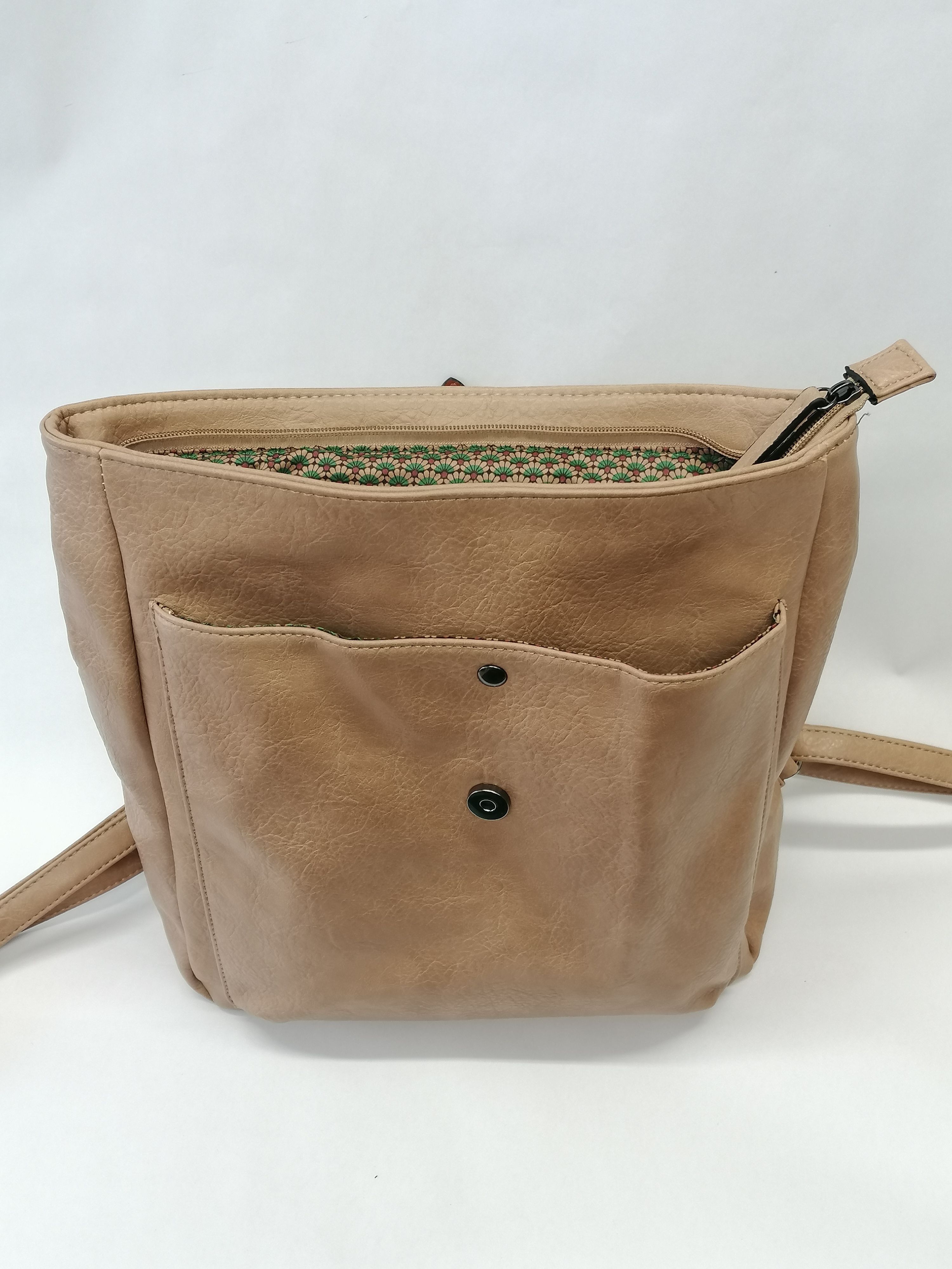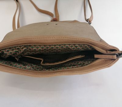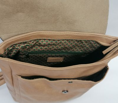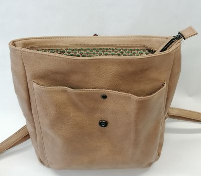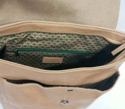 Batoh Melanie VEGAN béžový z eko kůže. Rozměry: výška 36 cm, šířka 26 cm, hloubka dno 9 cm a nahoru se zužuje do 6 cm hloubky. Pod klopnou je kapsa uzavíratelná na patent a je široká 25 cm a vysoká 27,5 cm. Hlavní velký prostor se uzavírá na zip. Uvnitř batohu v hlavní části jsou 2 malé kapsičky na drobnosti a jedna kapsa uzavíratelná zipem o délce 17 cm. V zadní části (záda) je další vsazená kapička uzavíratelná 17 cm zipem.