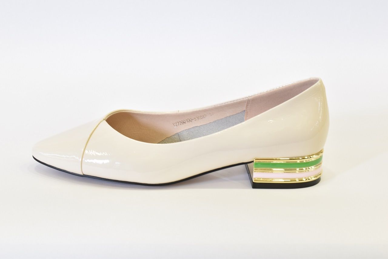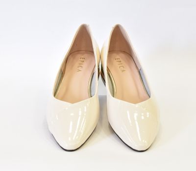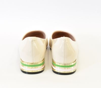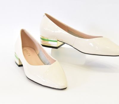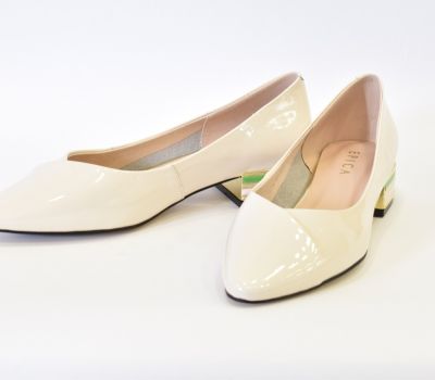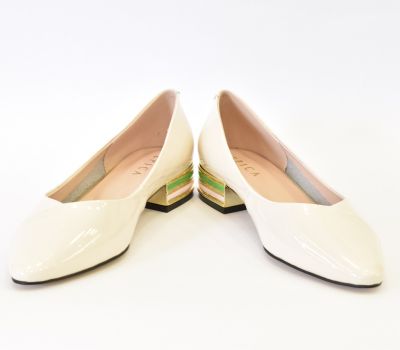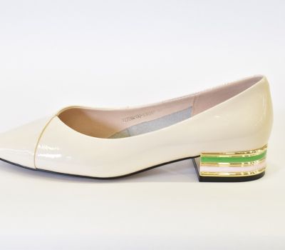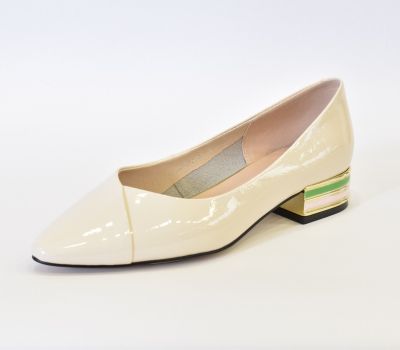 Luxusní lodička z lakované kůže je vyrobená v nejmoderňejšim designu světových trendů. S touto lodičkou ( balerinkou ) nemůžete trefit vedle. Je zdobená jemným překladem ve špičce. Zlatý podpatek zaujme na první pohled jemnou růžovou a zelenkavou linkou. Lodička je vhodná k šatům i kalhotovému kostýmku. Barva krémová smetanová.