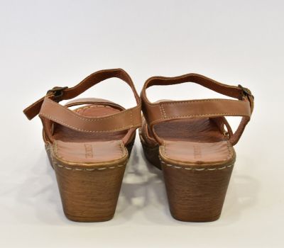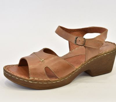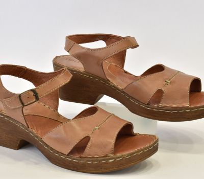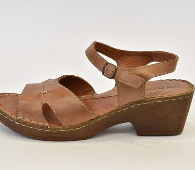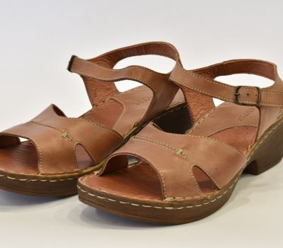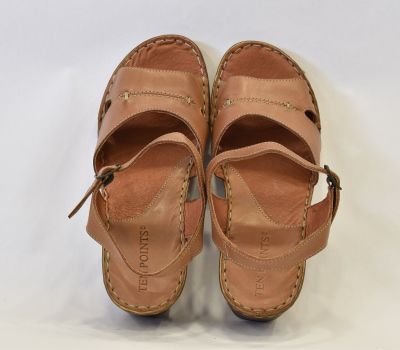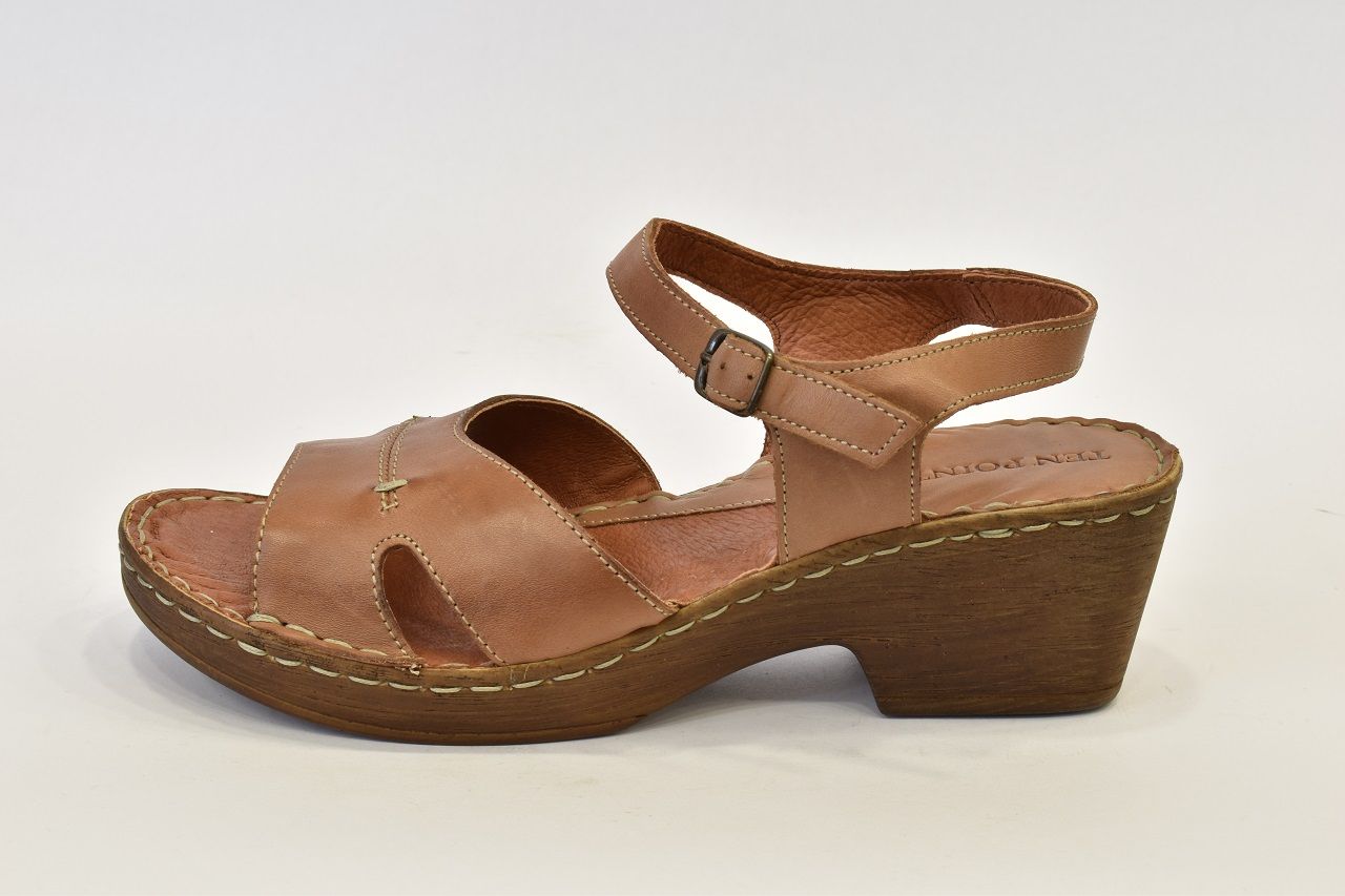 Luxusní hnědé letní sandále značky Ten Point ocení každá zákaznice svým kvalitním zpracováním. Na obuv je použita krásně měkká telecí pravá kůže, kterou oceníte při nošení "naboso." Kromě podešve a kovové spony na botách není nic ze syntetického materiálu. Pásek má z bočních stran výkroj a přes nárt je ozdoben béžovým prošitím. Pásek okolo kotníku má všitou gumičku a zavírá se kovovou sponou. Kožená stélka je vyměkčená a velmi pohodlná. Podešev je odlehčená, syntetická ve stylu dřeváku. Platforma je vysoká 2 cm až 6 cm do mírného podpatku. Sandálky se hodí k jakémukoliv letnímu outfitu.