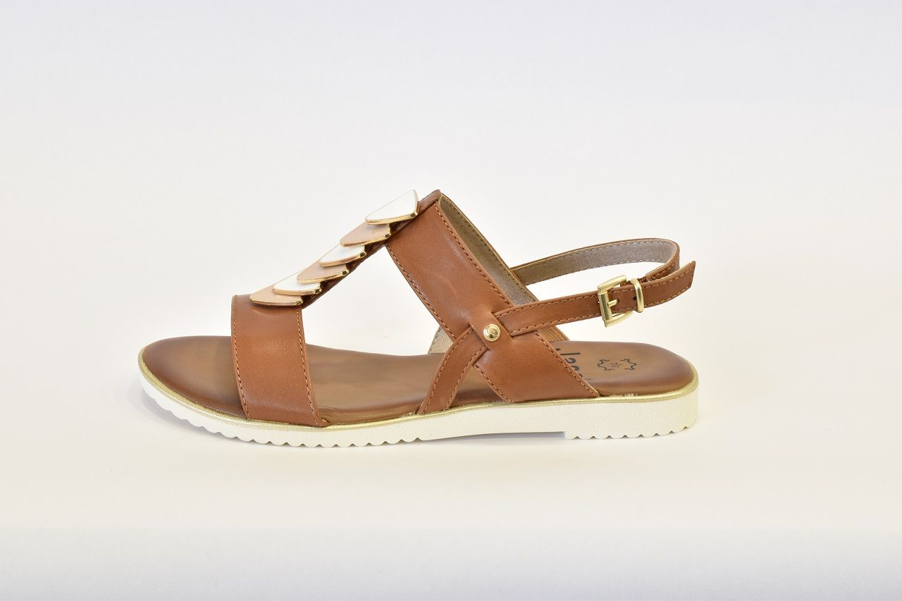 Dámská kožená sandále v široké šířce H v koňakové barvě Vás zaujme na první pohled svým kvalitním zpracováním. Kožený svršek obuvi tvoří dva vodorovné pásky spojené jedním svislým, který je ozdobený bílo-krémovými ozdobami. Horní pásek z vnitřní strany má všitou pružnou gumičku pro variabilní přizpůsobení se na nárt. Pásek za patu má taktéž všitou gumičku pro snadné obutí s kovovou přezkou. Vyměkčená kožená stélka se okamžitě přizpůsobuje tvaru Vašich nohou a dodává pocit pohodlí při chůzi. Nízká, rovná podešev se zlatou linkou je vyrobena technologií Soft FLEX, která je flexibilní a velmi komfortní.