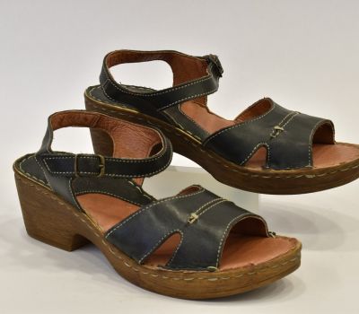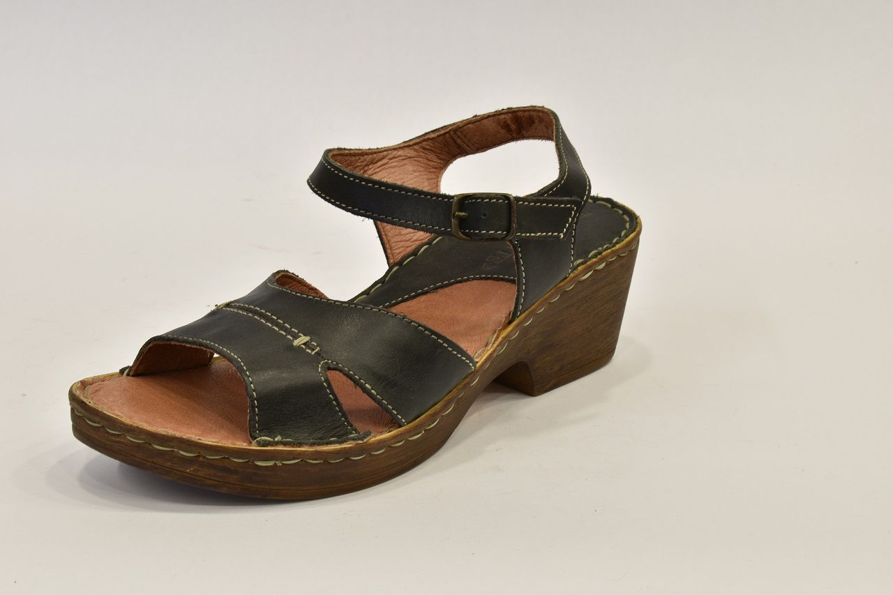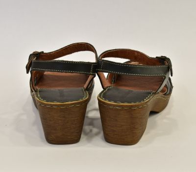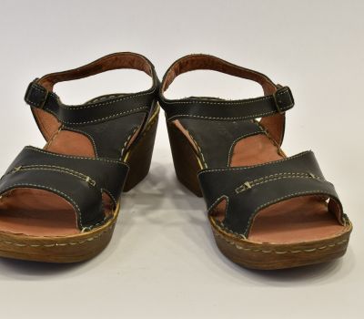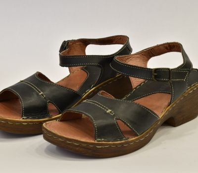 Luxusní černé letní sandále značky Ten Point ocení každá zákaznice svým kvalitním zpracováním. Na obuv je použita krásně měkká telecí pravá kůže, kterou oceníte při nošení "naboso." Kromě podešve a kovové spony na botách není nic ze syntetického materiálu. Pásek má z bočních stran výkroj a přes nárt je ozdoben béžovým prošitím. Pásek okolo kotníku má všitou gumičku a zavírá se kovovou sponou. Kožená stélka je vyměkčená a velmi pohodlná. Podešev je odlehčená, syntetická ve stylu dřeváku. Platforma je vysoká 2 cm až 6 cm do mírného podpatku. Sandálky se hodí k jakémukoliv letnímu outfitu.