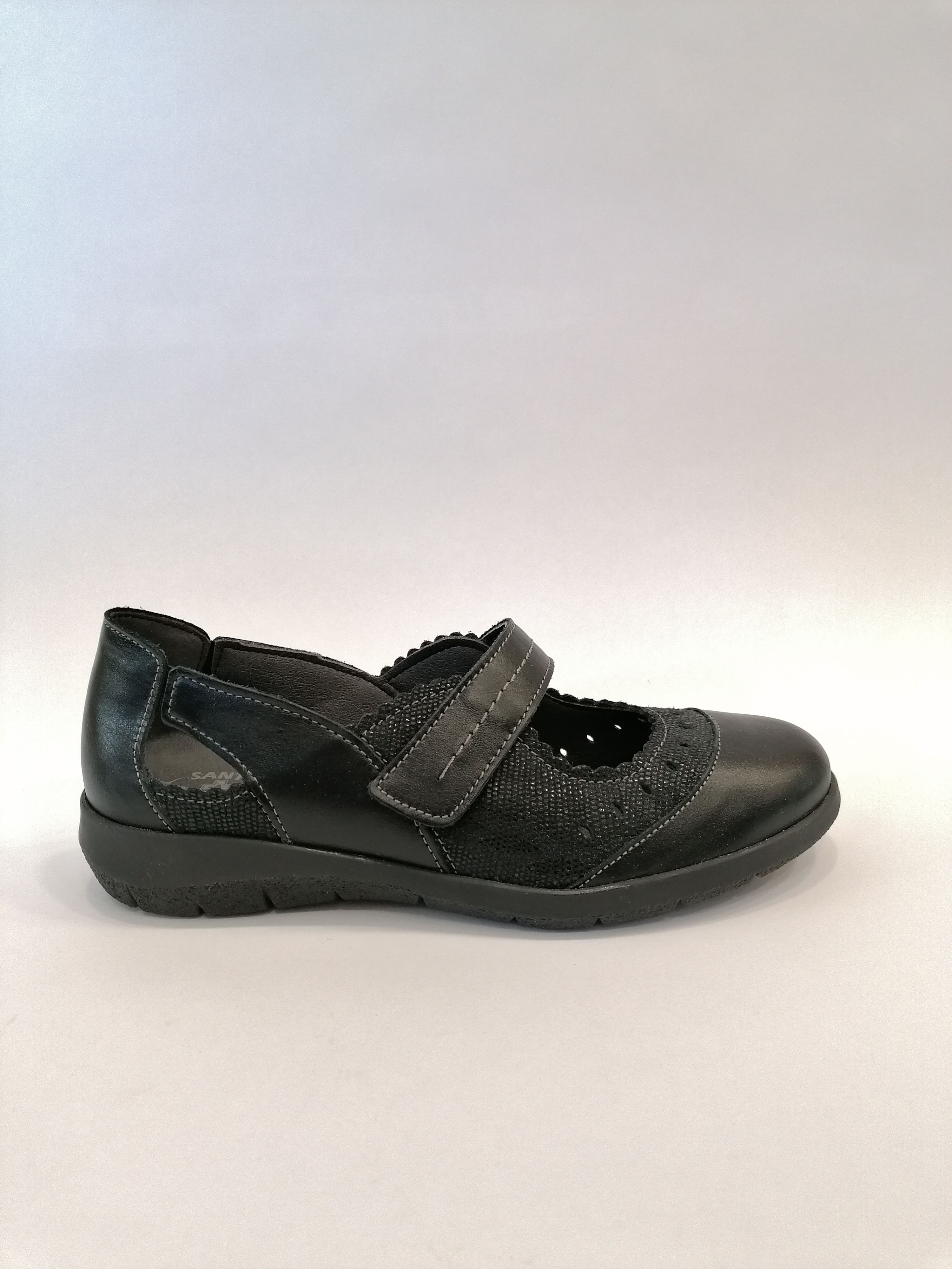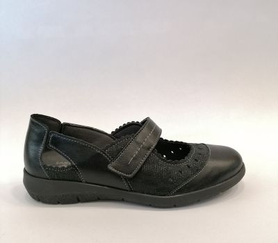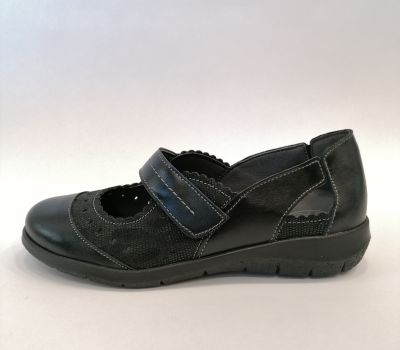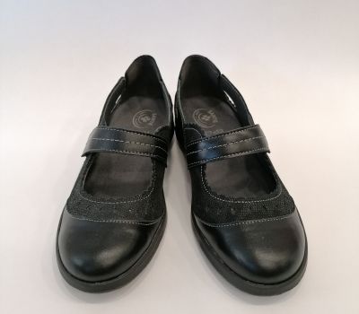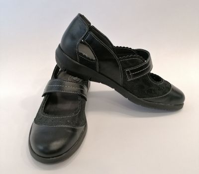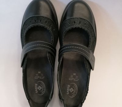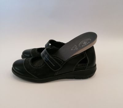 Celokožená černá obuv s vyjímatelnou stélkou ocení zákaznice které mají své ortopedické vložky dělané na míru. Obuv je lehká, elegantní a vhodná i ke společenským ůčelům . Obuv se zapíná páskem přes nárt.