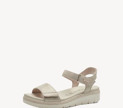 Svršek obuvi je vyroben z pravé přírodní kůže (nubuk patentní) v odstínech béžové barvy champagne. Obuv na nártu je ,vybavena suchým zipem, díky kterému si variabilně botu přizpůsobíte své noze. Pásek za patou má všitou pružnou gumičku pro pohodlné obutí. Sandálky se zapínají páskem na suchý zip, který je ozdoben sponou. Stélka je kožená, vyjímatelná, měkčená z pravé kůže, která se přizpůsobí chodidlu. Platforma je z kvalitní syntetiky do mírného klínku. V této botě budete mít pocit chůze "po mechu". Tento model je vhodný k jakémukoliv letnímu i společenskému outfitu.