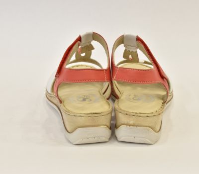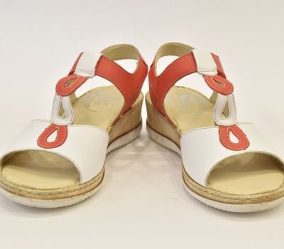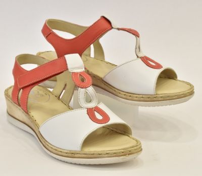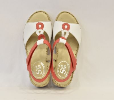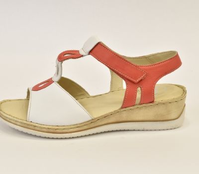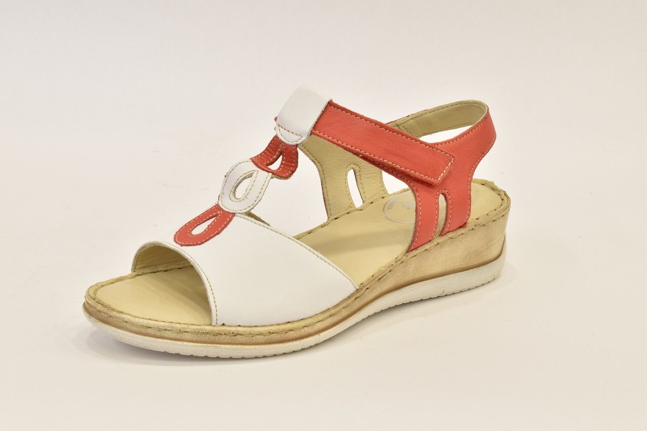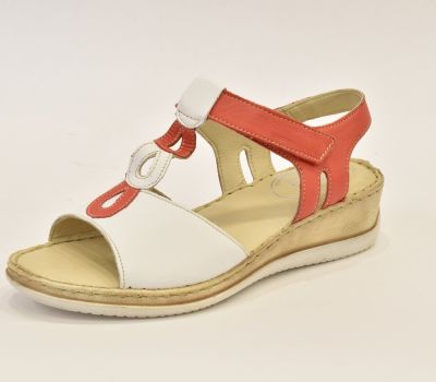 Letní zdravotní sandále v bíločervené barvě Vás zaujmou na první pohled svým kvalitním zpracováním a užitých materiálů. Obuv má jeden přední pásek v bíle barvě a na nártu je ozdobená bílými a červenými kapičkami z kůže. Zapínání okolo kotníku je na suchý zip. Tato anatomická obuv má platformu 1,8 cm až 4,3 cm do mírného klínku. Kožená stélka je neuvěřitelně měkká a komfortní pro došlap nohy. Tento model oživí Vás letní botník.