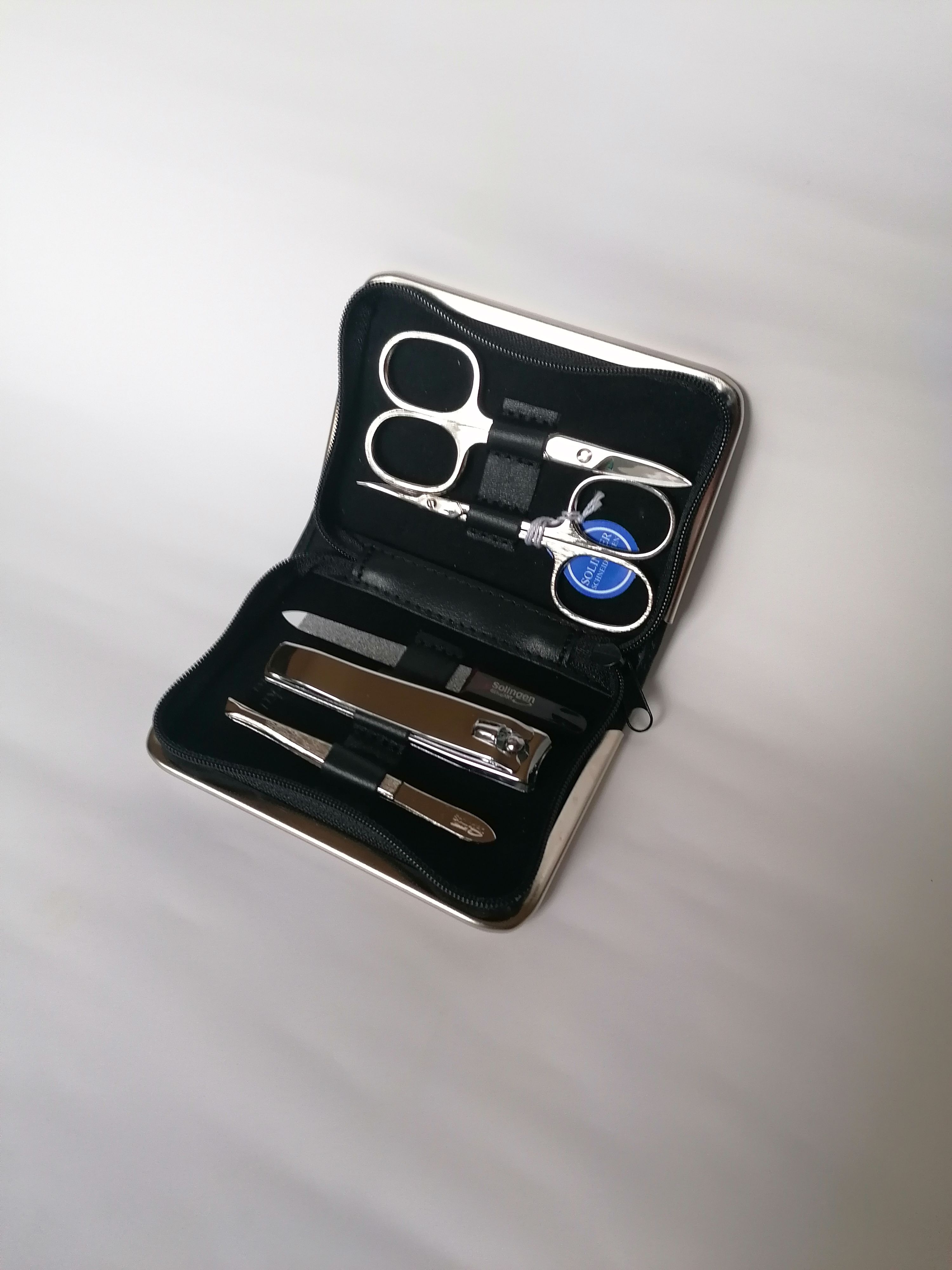 Nástroje v této manikúře jsou vyrobeny z kvalitní německé oceli značky Solingen. Pouzdro je vyrobené z luxusní hlazené kůže.