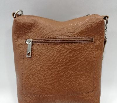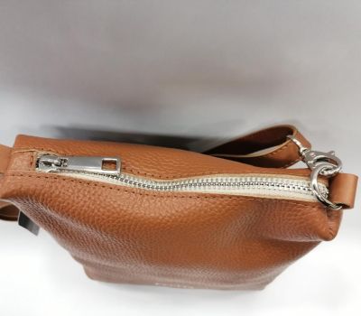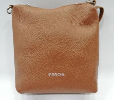 Kabelka kožená malá crossbody značky Ferchi v barvě Camel barvě cena 1390 Kč. Rozmery: 20 x 20 x 6, 5 cm. Kabelka má nastavitelný dlouhý trak na rameno či přes tělo, který se dá odepnout karabinami. Kabelka se zapíná na zip. Vnitřní prostor je volný. Na zadní části kabelky je kapsička na drobnosti uzavíratelná na zip.