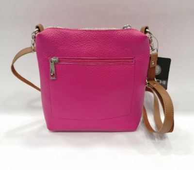 Kabelka kožená malá crossbody značky Ferchi v růžové barvě cena 1390 Kč. Rozmery: 20 x 20 x 6, 5 cm. Kabelka má nastavitelný dlouhý trak na rameno či přes tělo, který se dá odepnout karabinami. Kabelka se zapíná na zip. Vnitřní prostor je volný. Na zadní části kabelky je kapsička na drobnosti uzavíratelná na zip.