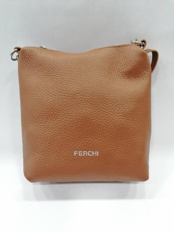 Kabelka kožená malá crossbody značky Ferchi v barvě Camel barvě cena 1390 Kč. Rozmery: 20 x 20 x 6, 5 cm. Kabelka má nastavitelný dlouhý trak na rameno či přes tělo, který se dá odepnout karabinami. Kabelka se zapíná na zip. Vnitřní prostor je volný. Na zadní části kabelky je kapsička na drobnosti uzavíratelná na zip.