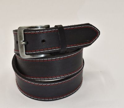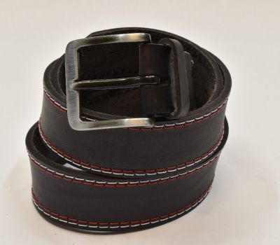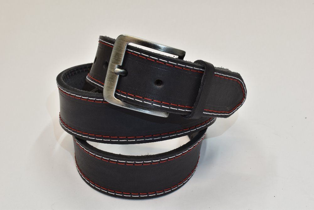Řezaný kožený opasek prošívaný bílou a červenou nití