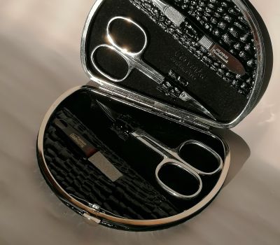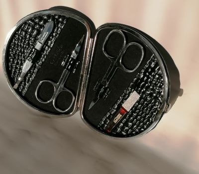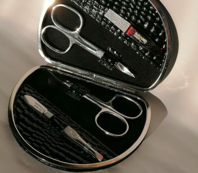 Luxusní dámská manikura v půlkulatém pouzdře . Je vyrobená z luxusní lakované kůže. Dekor had v barvě černé. Veškeré nástroje jsou v nejvyšší kvalitě Solingen.