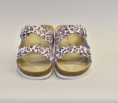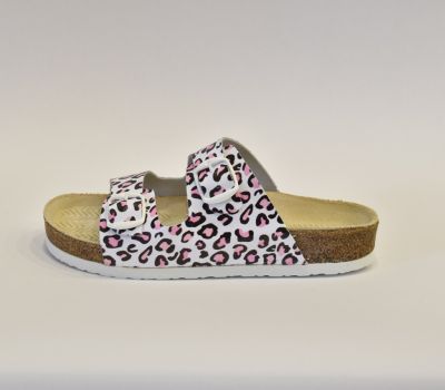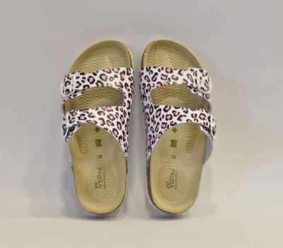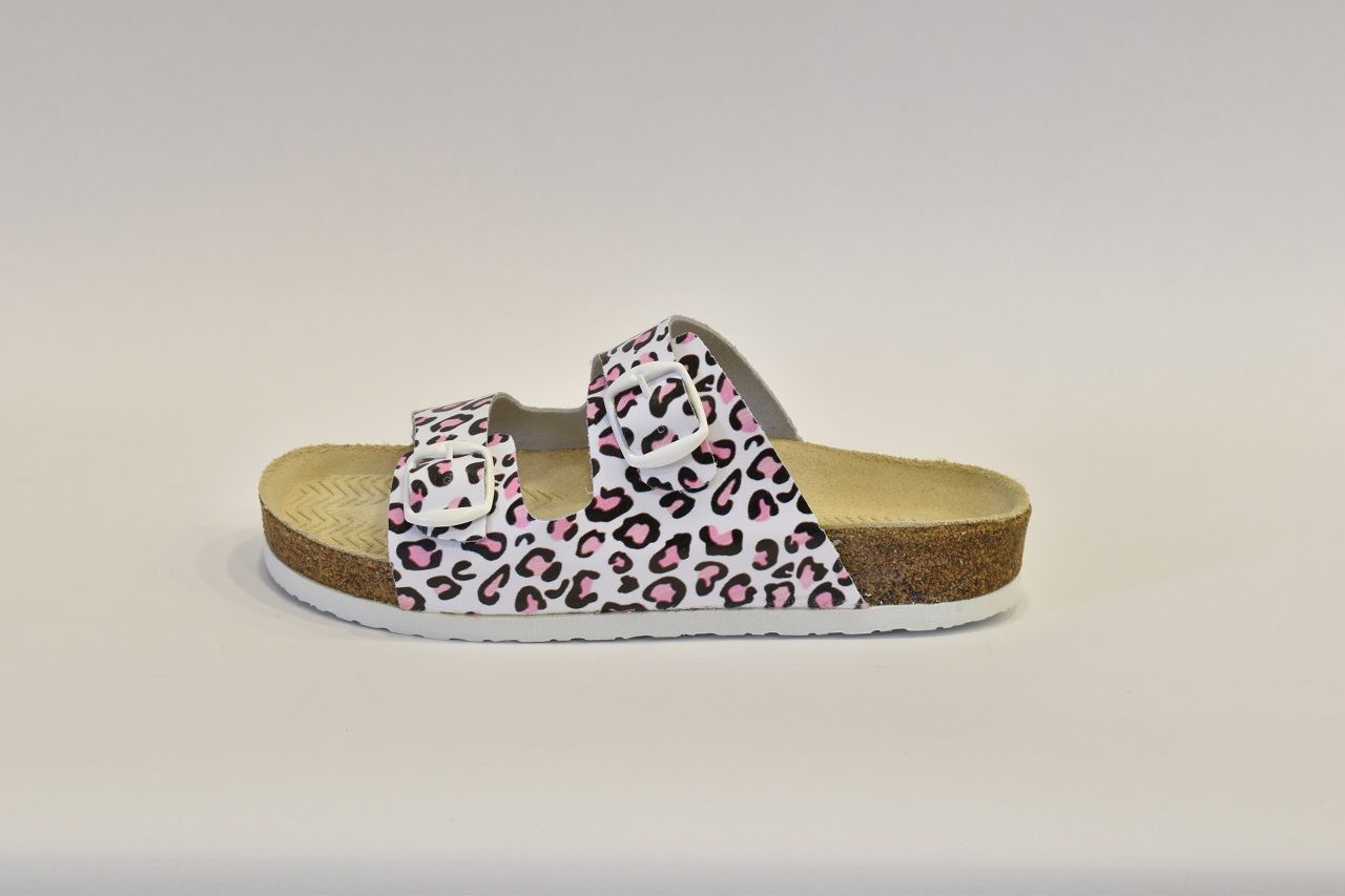 Odlehčené nadčasové pantofle s korkovou mezipodešví a dvěma koženými pásky s kovovými sponami umožňujícími přizpůsobení velikosti. Ortopedicky tvarované stélka potažená přírodní kůží a odlehčená podešev odolná proti uklouznutí Vám zajistí zdravé a pohodlné obutí na doma, do školy i do práce.
