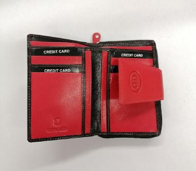 Dámská peněženka Isla červená- černá z luxusní kůže kozinka. Peněženka je rozdělena do tří částí. První sekce je určená na bankovky a karty. Přihrádky na bsnkovjy jsou 2, prostor na 6 karet a další 4 vsazené kapsy buď na karty anebo na vizitky. Druhá sekce je kapsička na mince, která je rozdělená přepážkou do které si můžete vložit kartu a zavírá se zipem. Třetí sekce je opět určena na 5 karet a další 3 vsazené kapsy, z toho jedna je z fólie vhodná na fotografie. Rozměr :9x13,5x4 cm