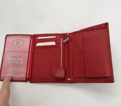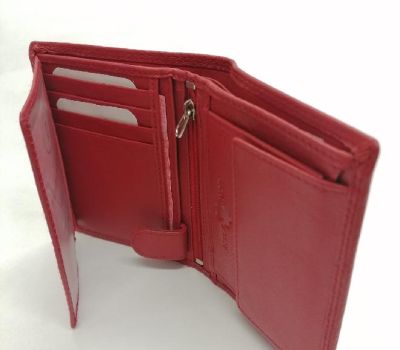 Dámská červená peněženka Anna, rozměr 9x12,5x2 cm. Uvnitř peněženky se nachází prostor pro 8 karet, z toho jsou dvě vybaveny fólií na fotografie a 3 vsazené kapsy po stranách. Kapsa na mince se uzavírá na druk. Peněženka je vyrobena z pravé přírodní kůže, která je příjemná na dotek.