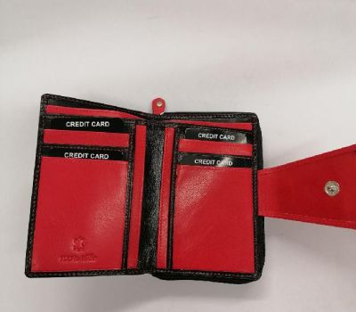 Dámská peněženka Isla červená- černá z luxusní kůže kozinka. Peněženka je rozdělena do tří částí. První sekce je určená na bankovky a karty. Přihrádky na bsnkovjy jsou 2, prostor na 6 karet a další 4 vsazené kapsy buď na karty anebo na vizitky. Druhá sekce je kapsička na mince, která je rozdělená přepážkou do které si můžete vložit kartu a zavírá se zipem. Třetí sekce je opět určena na 5 karet a další 3 vsazené kapsy, z toho jedna je z fólie vhodná na fotografie. Rozměr :9x13,5x4 cm