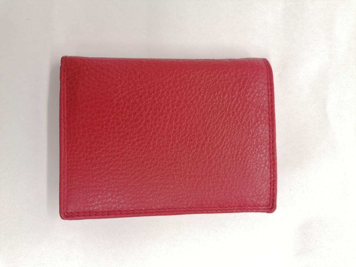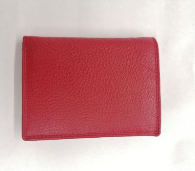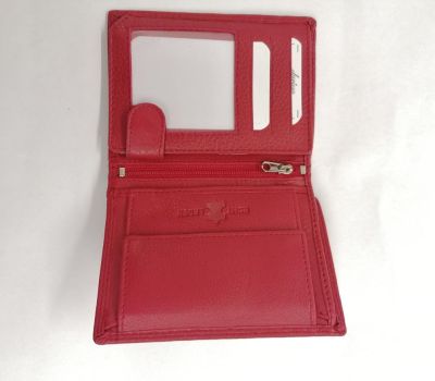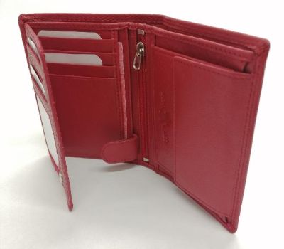 Dámská červená peněženka Anna, rozměr 9x12,5x2 cm. Uvnitř peněženky se nachází prostor pro 8 karet, z toho jsou dvě vybaveny fólií na fotografie a 3 vsazené kapsy po stranách. Kapsa na mince se uzavírá na druk. Peněženka je vyrobena z pravé přírodní kůže, která je příjemná na dotek.
