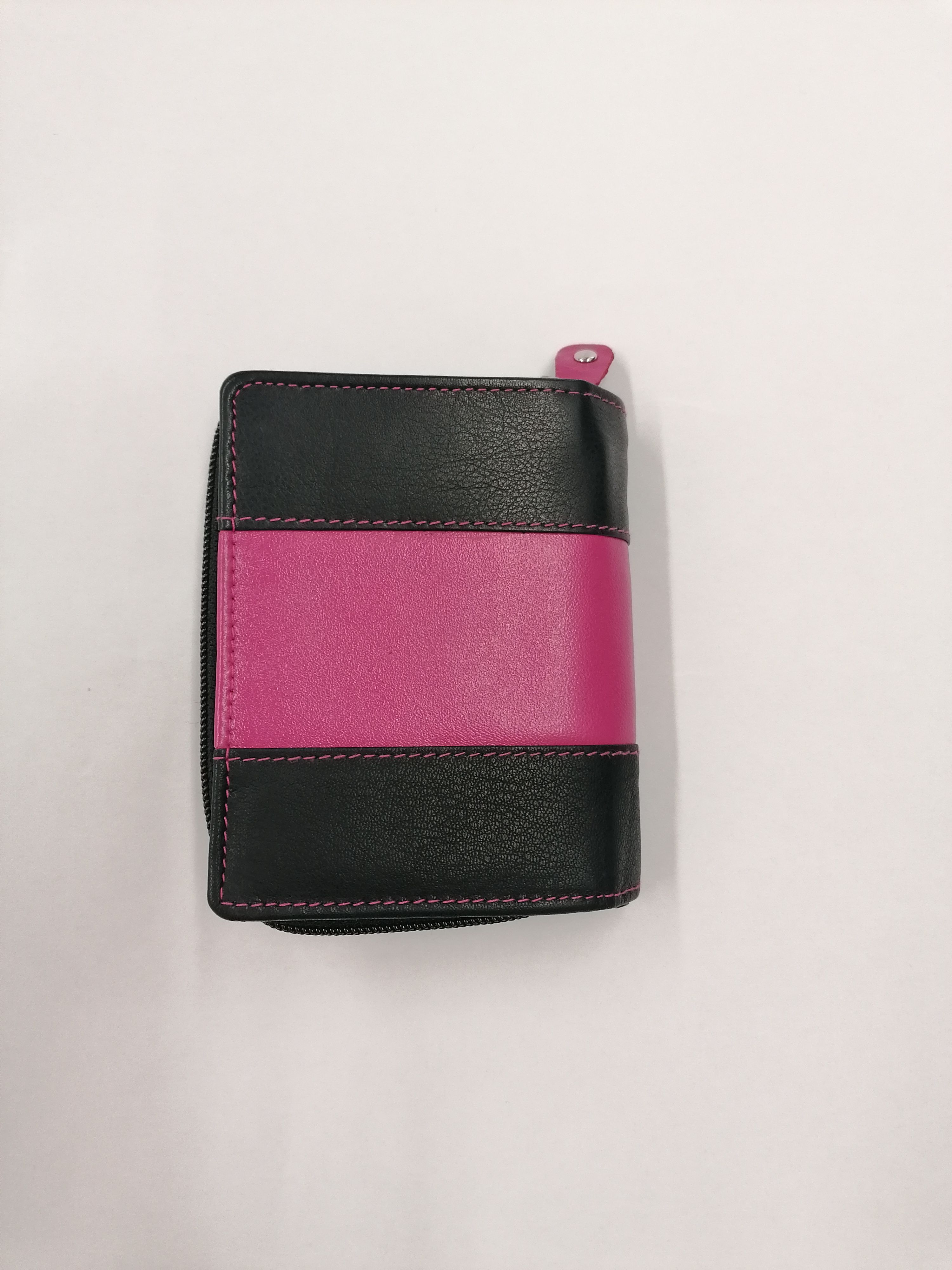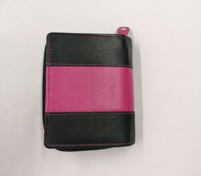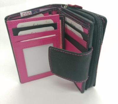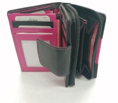 Dámská peněženka Darina černá s růžovým pruhem. Rozměr 9,5x12x3,5 cm. Uvnitř peněženky je prostor na 12 karet, z toho je jedna vybaveny průhlednou fólií na fotografie, a 5 kapsiček vsazených na doklady a 2 přihrádky na papírové bankovky. Peněženka se zapíná na pásek s drukem. Kapsa na mince se zavírá zipem a je rozdělena přepážkou. Navíc uvnitř po stranách jsou 2 kapsičky na platební karty. Peněženka je z krásné telecí kůže, příjemná na omak.