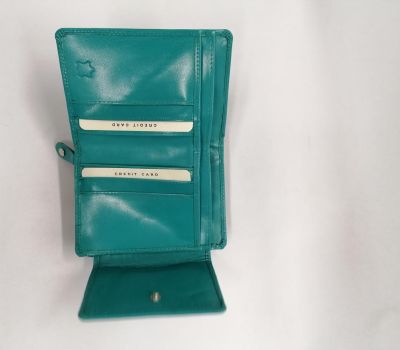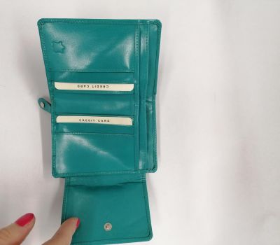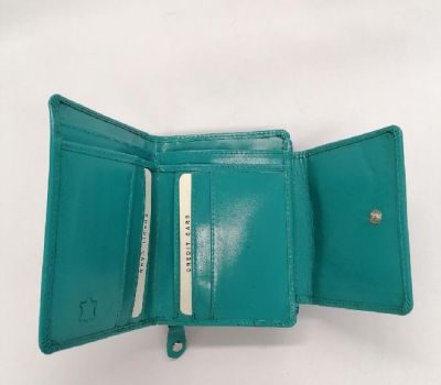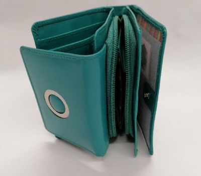 Dámská peněženka Holly tyrkysová zdobená stříbrným kroužkem.  Rozměr 8,5 x 11,5 x3, 5 cm. Peněženka rozdělena do tří částí. První část, určená na papírové bankovky a karty, která se zavírá upínkou na druk. 2 kapsy na bankovky a 6 karet. Druhá část kapsa na mince se zavírá zipem a je rozdělena separací. Třetí část je určená na doklady či karty zapíná se drukem. Tato menší peněženka udělá radost všem ženám, které mají rády barvy a používají menší kabelky.