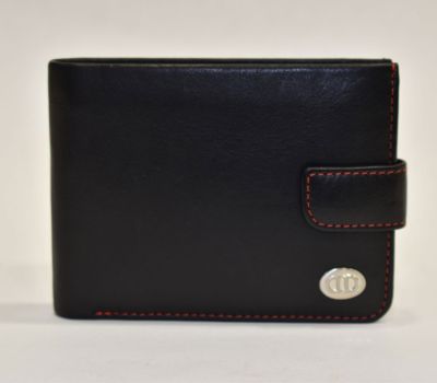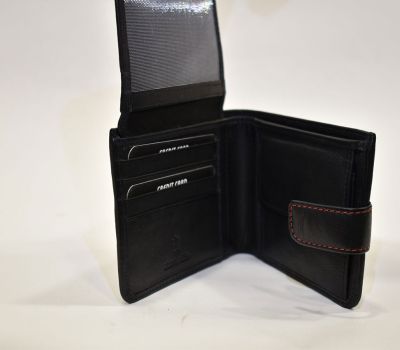 • Černá pánská peněženka z napa kůže, zdobená černým prošitím.