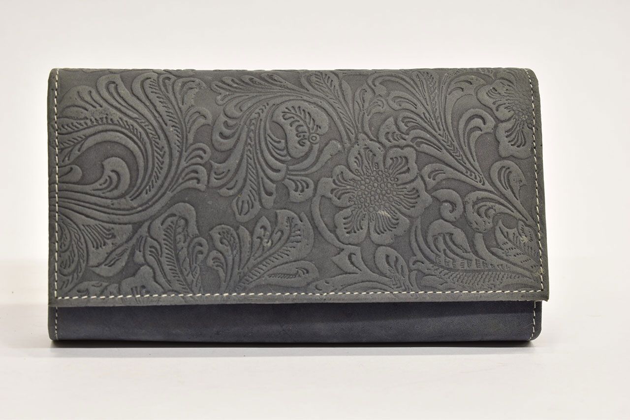 • Popis: peněženka z hovězí kůže s ražbou květů je prošívaná nití. Uvnitř má 3 fochy na bankovky, 3 fochy na doklady, 14 přihrádek na kreditní karty.