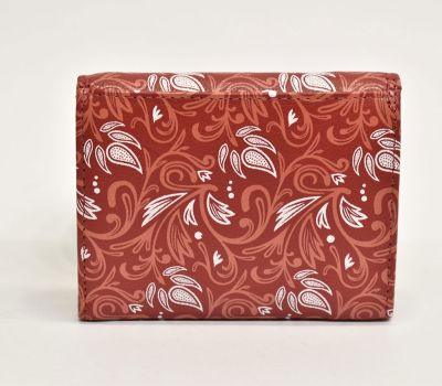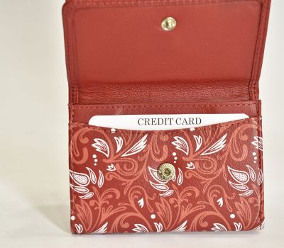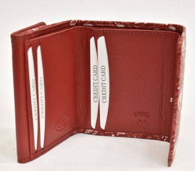 Peněženka má jednu dlouhou kapsu na bankovky a 5 přihrádek na platební karty. Prostor na mince i na bankovky se uzavírá drukem. Barva u tohoto vzoru je červená.